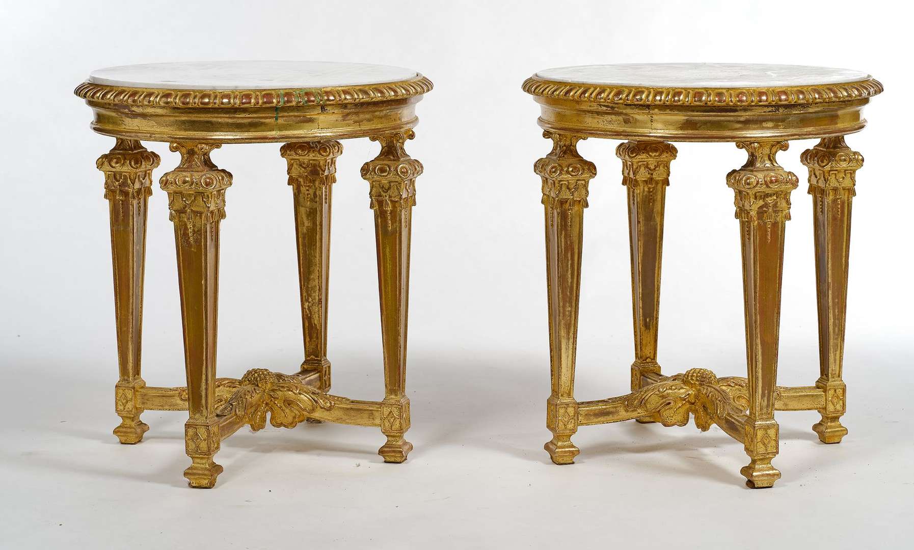 en bois doré à plateaux circulaires en marbre blanc. les piètements quadripodes en forme de gaines et reliés chacun par une entretoise en X.