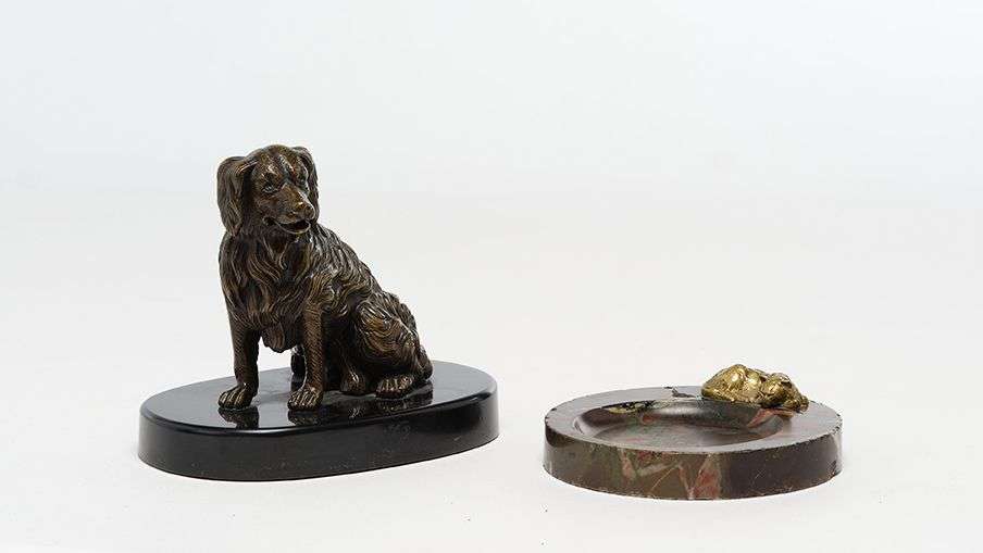 - Un chien assis en bronze sur un socle en pierre noire. Hauteur : 13 cm - Largeur : 15,5 cm - Profondeur : 10,2 cm ~