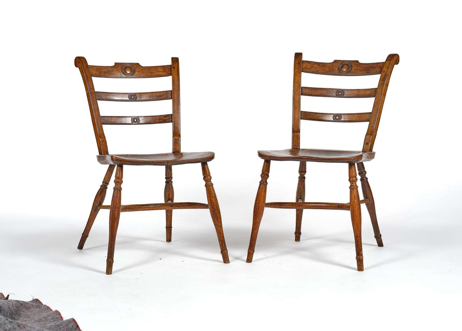 en bois laissé au naturel. Les dossiers ajourés et les pieds tournés en balustre reliés par une entretoise.