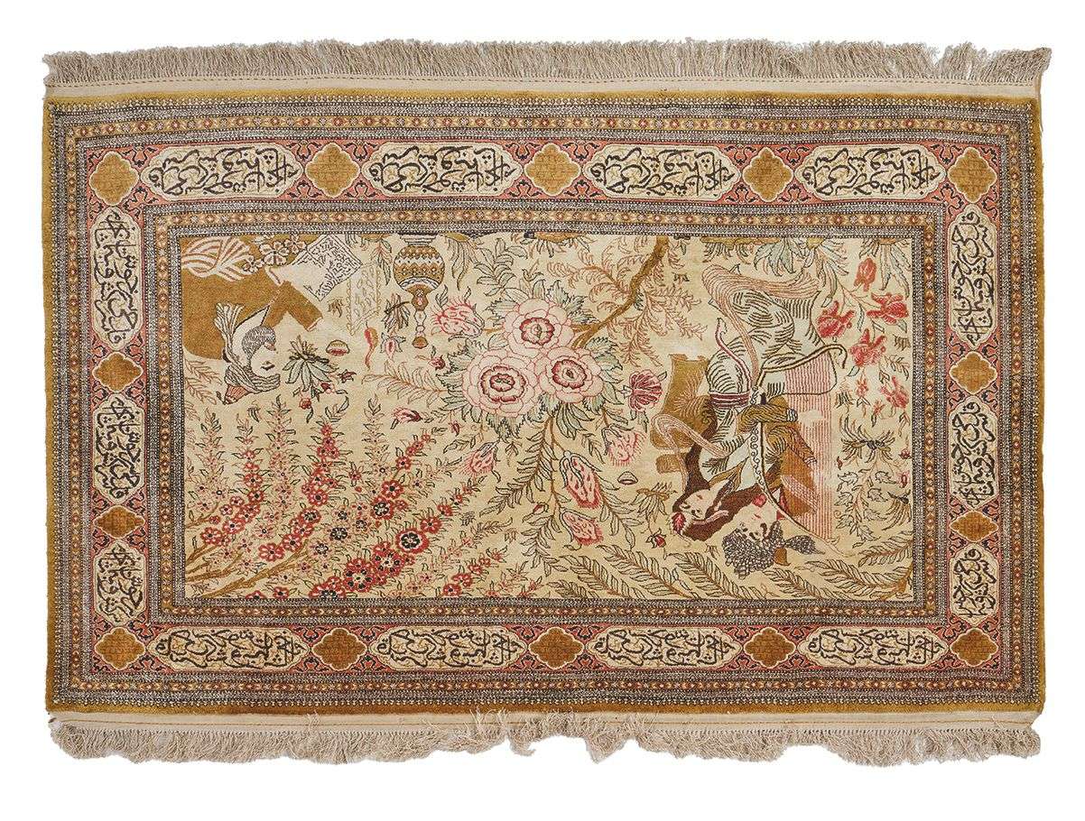 Velours de soie sur fondations en soie. Champ beige doré à décor poétique de scène galante persane, fiançailles ou mariage. Orné d'arbres de vie richement fleuris en polychromie, entourés de brins et branchages floraux. Bordure principale à semis de cartouches incrustés d'inscriptions poétiques.