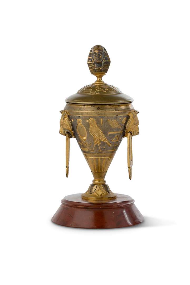 en bronze à décor égyptien, le couvercle surmonté d'une tête de pharaon, les anses maintenues par des têtes de lions et le fût décoré de hiéroglyphes. ~