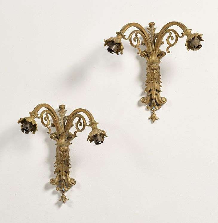 en bronze doré à deux bras de lumière à décor de rinceaux. Les futs ornés d'un mascaron.~