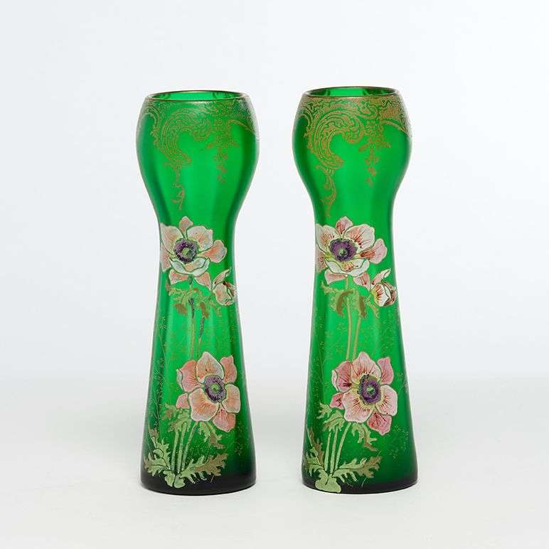 à pans coupés en verre teinté vert. La panse ornée d'un décor émaillé de fleurs et de motifs en réhauts dorés tels que brindilles et lambrequins.~