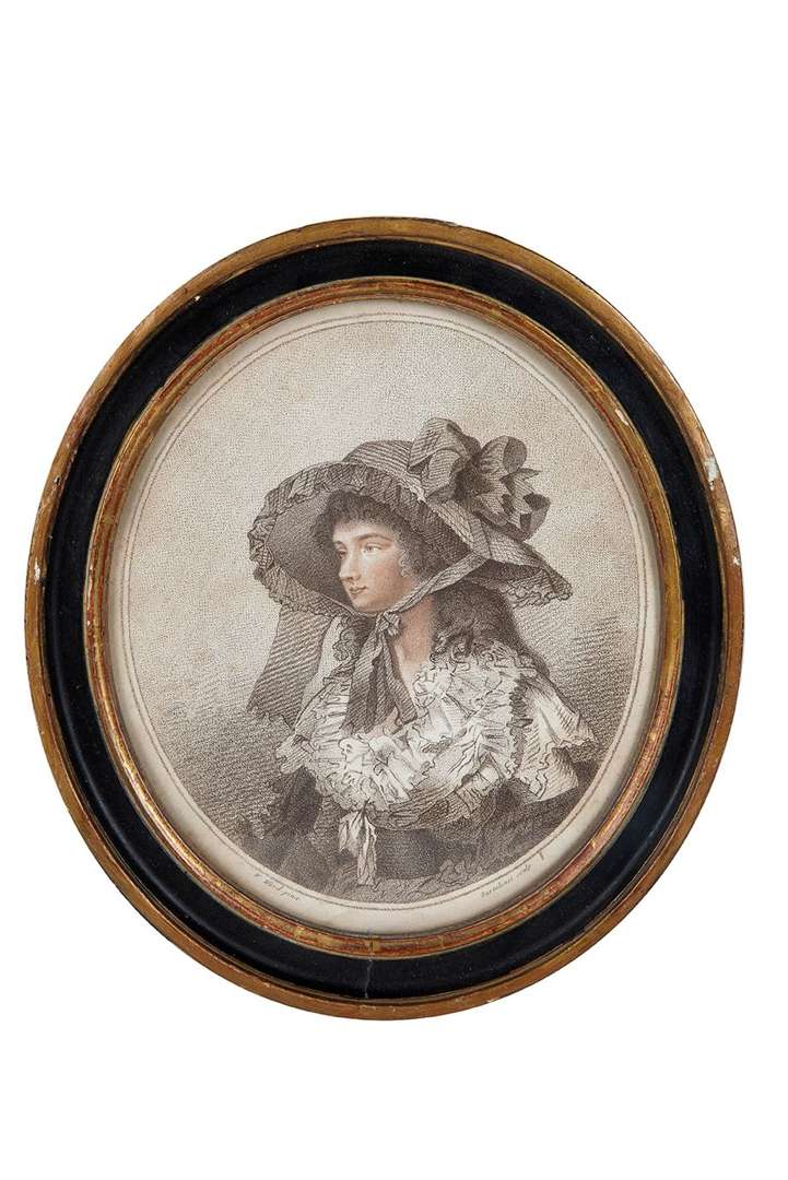 Une paire de gravures représentant chacune un portrait de jeune élégante au chapeau. De formes ovales encadrées, d'après Bartoloni.~
