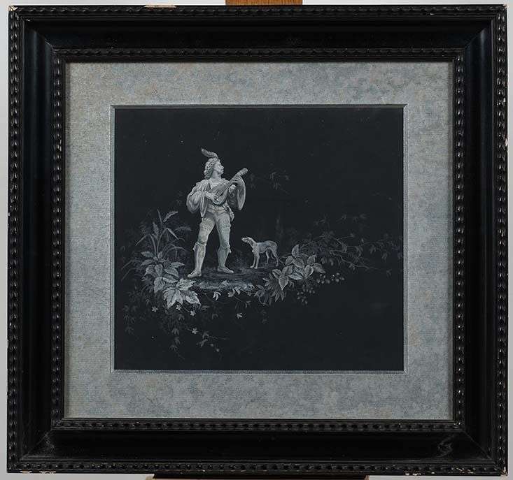 Estampe rehaussée de grisaille de gouache. ~