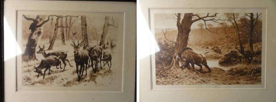 Paire de gravures encadrées -Bain de sangliers -Harde de cerfs