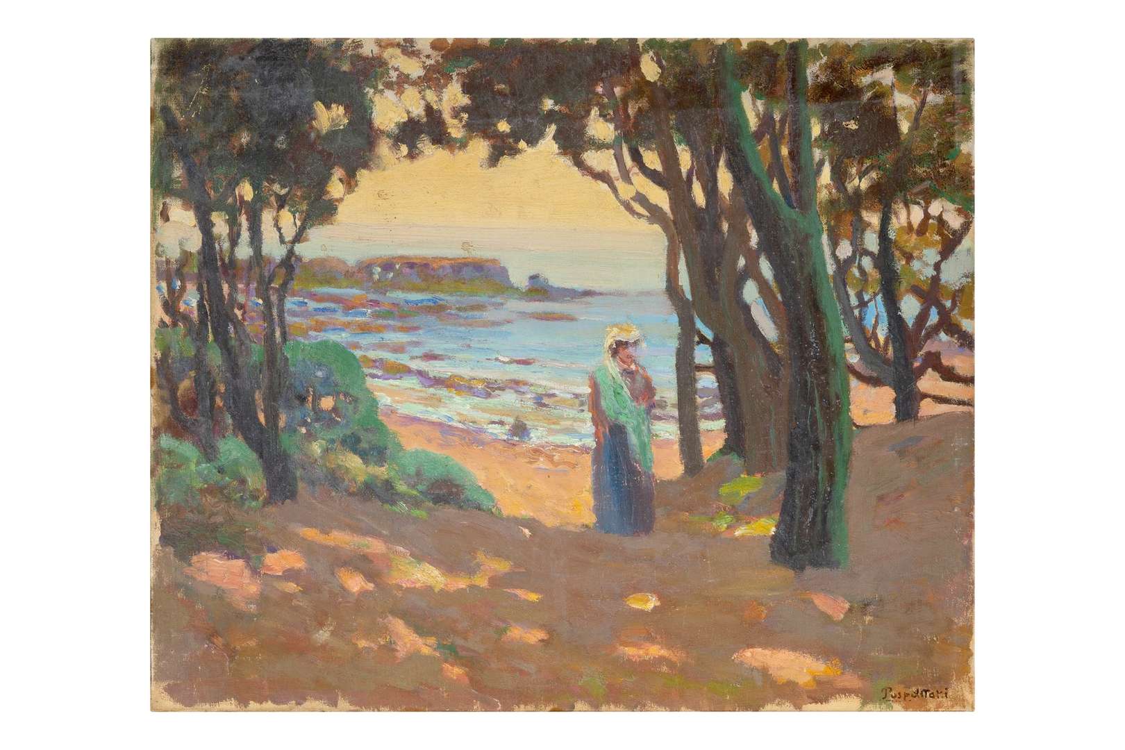Evgeni Ivanovitch Pospolitaki, dit Eugène Pospolitaki, est né en 1852 à Temriouk, dans le Sud-Ouest de la Russie. Il est le fils d'un sergent de l'armée russe. À 21 ans, après une formation en génie civil et en bâtiment, il s'inscrit à l'Académie des Beaux-arts de Saint-Pétersbourg. Une fois diplômé, il se rend à Moscou où il séjourne de 1875 à 1879. La Galerie Tretiakov lui fait l'acquisition d'un tableau peint en 1877 : "Le soir". L'année suivante, l'artiste prend ses quartiers à Paris, alors capitale des arts. Sensible au travail sur la lumière engagé par les Impressionnistes, il peint des bords de mer avec une palette divisée de tons vifs. De retour en Russie, Pospolitaki participe au Salon des amateurs d'art de Moscou aux côtés de Viktor Mikhaïlovitch Vasnetsov (1848-1926), Isaac Ilitch Levitan (1860-1900) ou encore Valentin Aleksandrovitch Serov (1865-1911). Il regagne Paris en 1889 et prête, pour l'Exposition universelle, une toile intitulée "Sommet de l'Elbrouss | - Caucase". Il reçoit à cette occcccasion une Mention honorable. En 1892, il présente "Le mont Uzhba" à la XIIe Exposition périodique de la Société Moscovite des Beaux-Arts. L'année suivante, il s'installe à Iekaterinodar (Krasnodar) afin d'enseigner à la première Académie de peinture pour femmes. Conjointement à cette activité et grâce à l'héritage de son père, Pospolitaki fonde la première école privée de dessin au rez-de-chaussée de sa maison. L'école sera reprise en 1905 par l'un de ses élèves, un certain Stupnikov. Pospolitaki retourne ensuite à Paris et s'essaie à la critique d'art. Quatre années plus tard, en Russie, il expose une série de paysages du Caucase à la IVe Exposition de peinture de la Société des artistes sans parti de Saint-Pétersbourg. De nouveau à Paris en 1911, l'artiste peint "La Tour Clovis (Paris), ancienne tour de l'Abbaye Sainte-Geneviève, peinte depuis l'arrière du Panthéon". À l'arrière du tableau, une étiquette mentionne le 4e Salon du mobilier, section Beaux-Arts (Paris, Grand Palais des Champs-Élysées). La fin de la vie de Pospolitaki est peu documentée. Il a probablement vécu à Saint-Pétersbourg jusqu'à sa mort vers 1915.