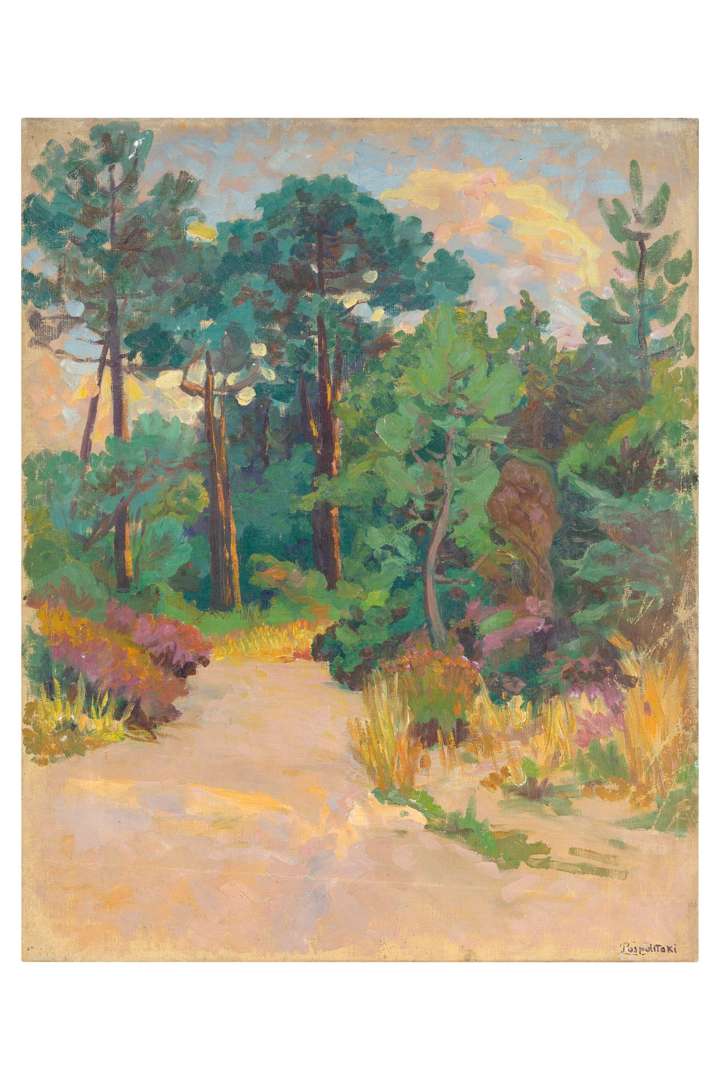 Sentier dans la pinède - Arbustes et pins