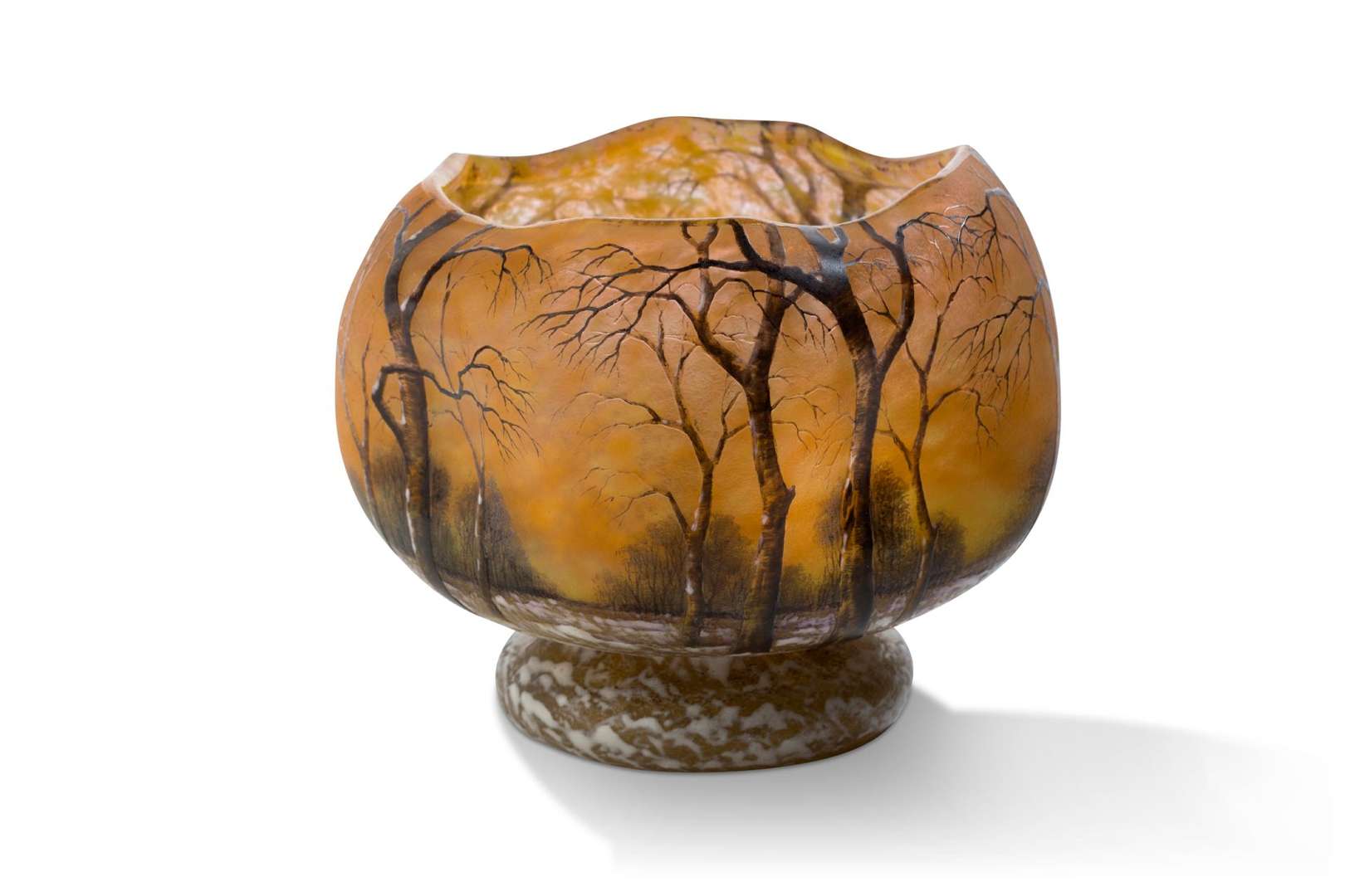 En verre multicouche jaune et orangé, à décor gravé à l'acide et émaillé d'un paysage de neige arboré, teintes brunes, ocre et blanches.