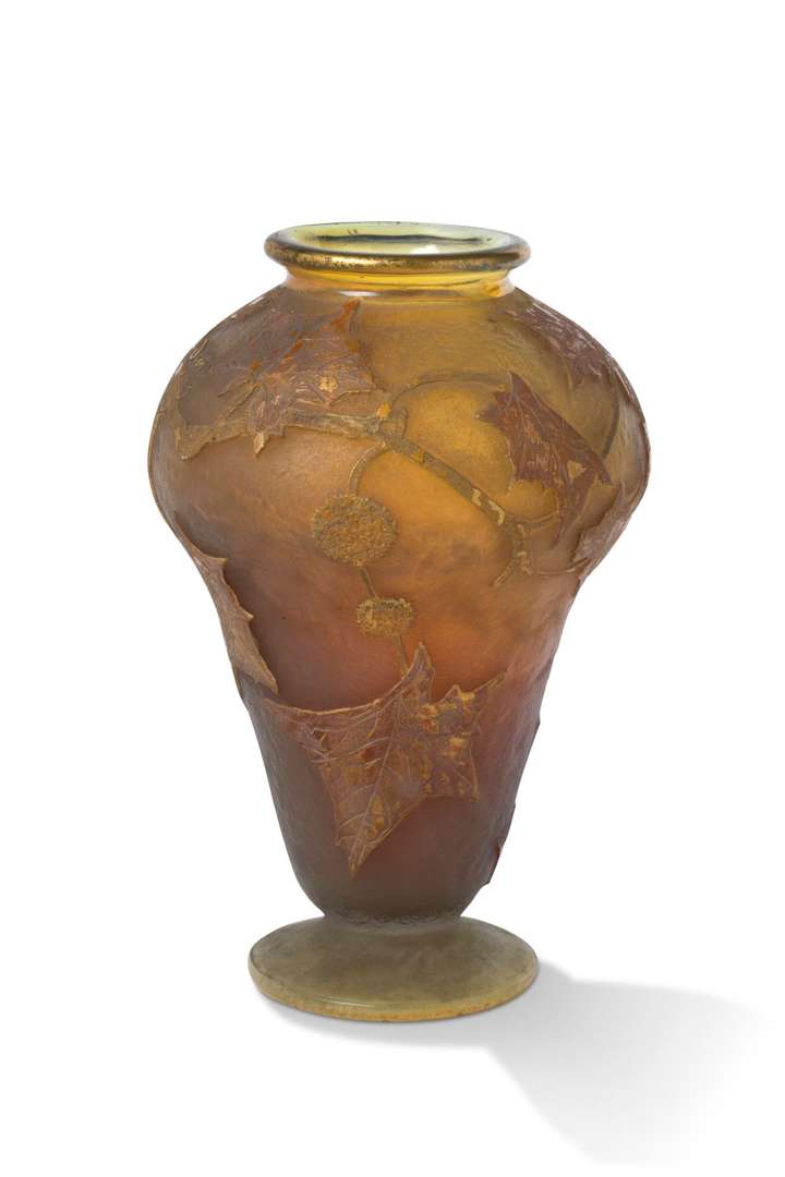 En verre multicouche beige sur fond brun clair et vert, à décor gravé à l'acide et émaillé or de feuilles d'érable.