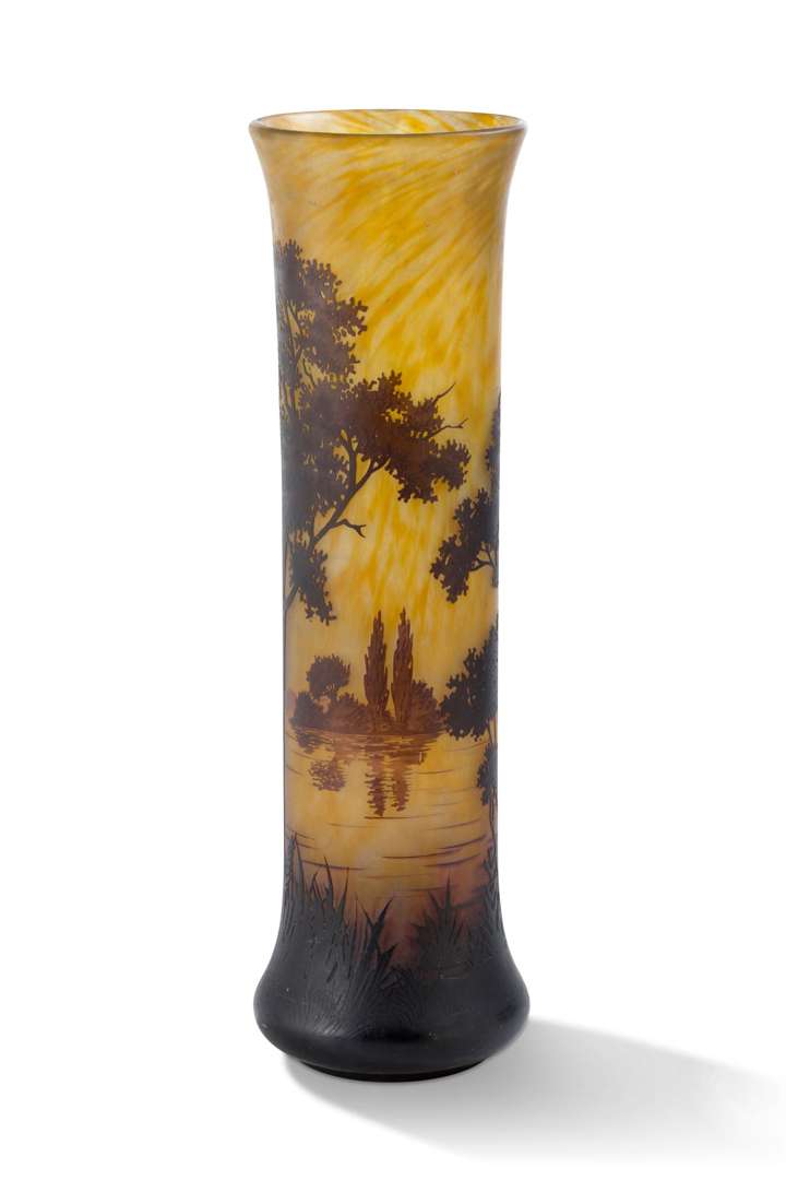 En verre multicouche brun et ocre sur fond satiné jaspé de jaune orangé, à décor gravé à l'acide d'un paysage lacustre.