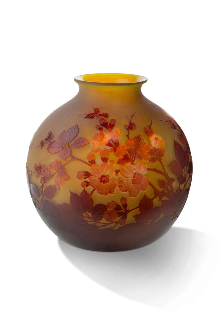En verre multicouche brun et orange sur fond satiné jaune, à décor gravé à l'acide de fleurs et de branchages.