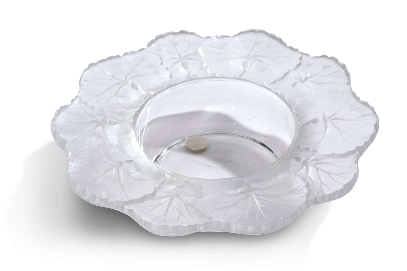 En verre blanc moulé pressé, à décor de feuilles de vigne.~