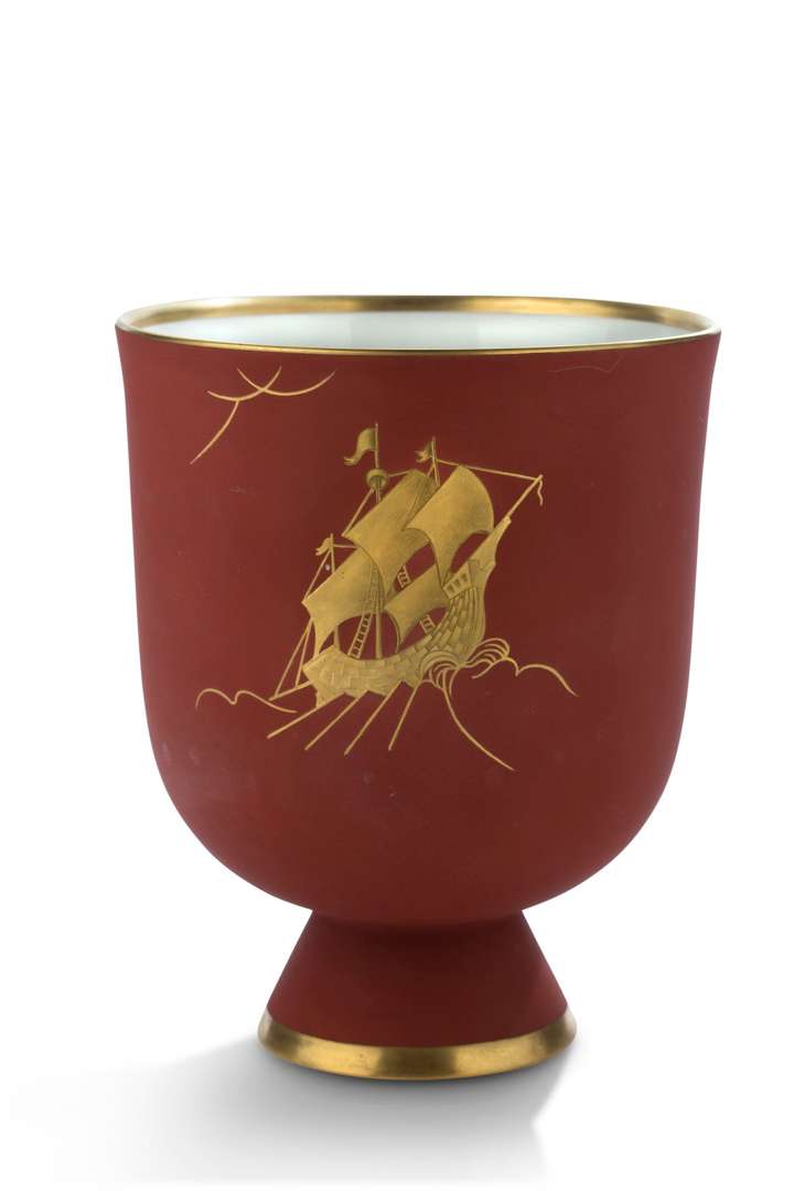 En porcelaine blanche à décor à l'or sur fond ocre mat d'un bateau à voile.~