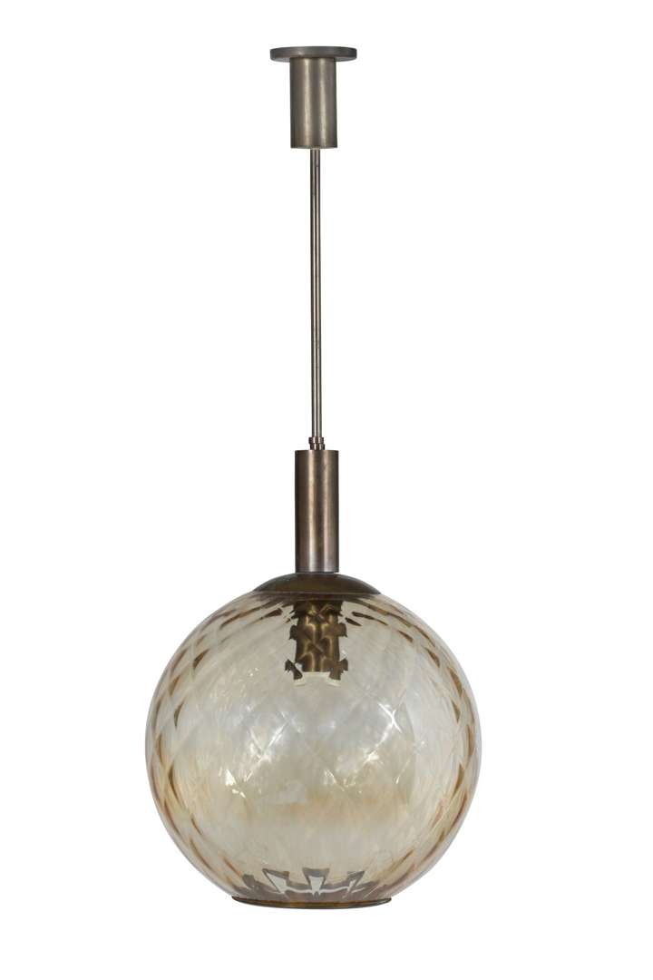 Fût et cache-bélière en laiton patiné, globes en verre teinté jaune à décor de croisillons.