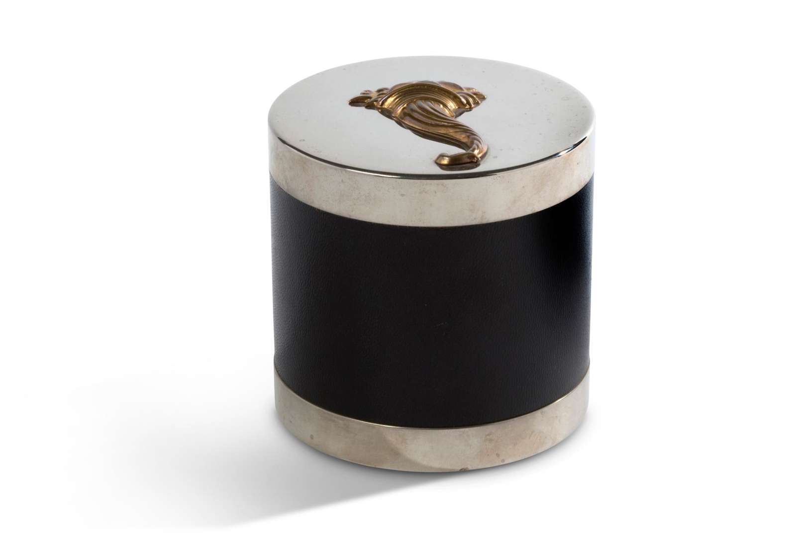 En métal argenté et cuir grainé noir, le couvercle orné d'une corne d'abondance dorée.