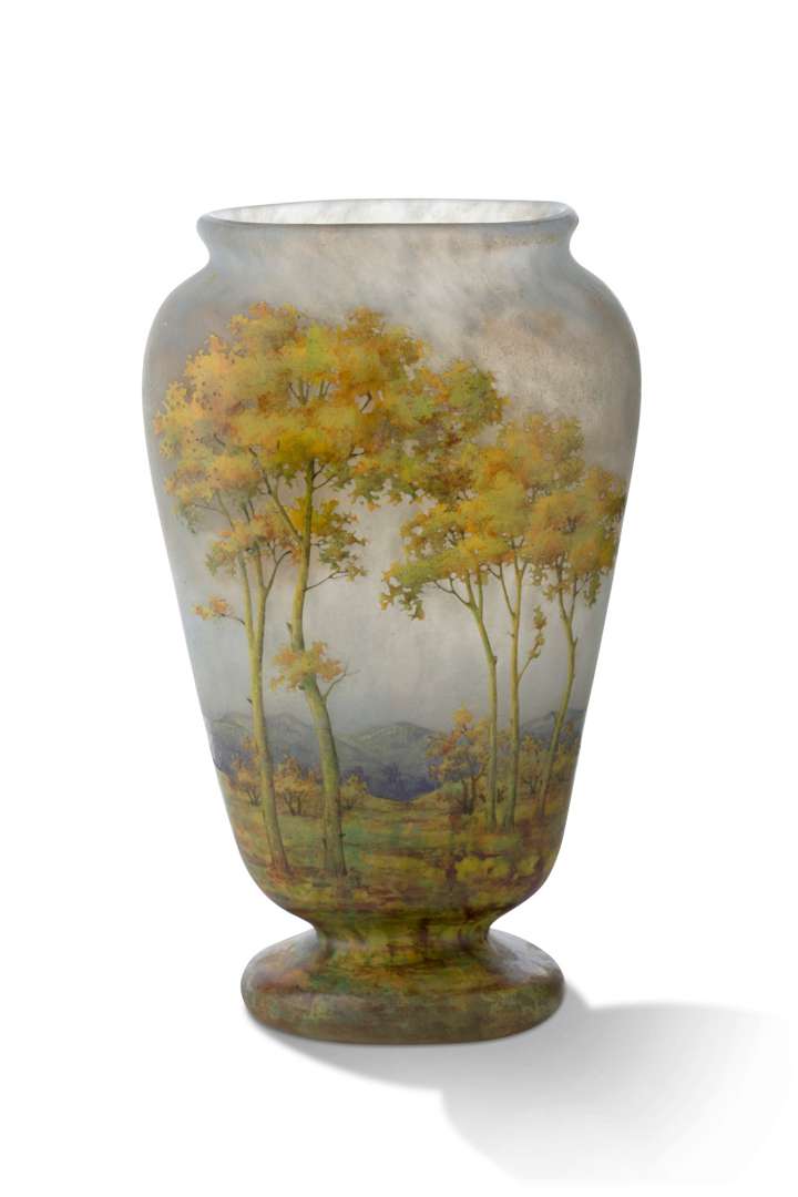 En verre jaspé bleu, à décor gravé à l'acide et émaillé d'un paysage de prairies arborées sur fond de montagnes, teintes vertes, jaunes, ocre et anthracite. Signature émaillée "Daum Nancy".