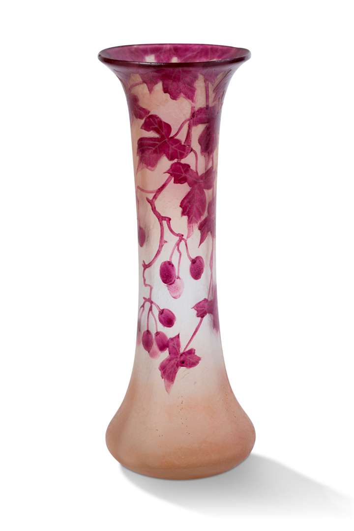 En verre multicouche pourpre sur fond satiné, à décor gravé à l'acide de vignes et raisins.