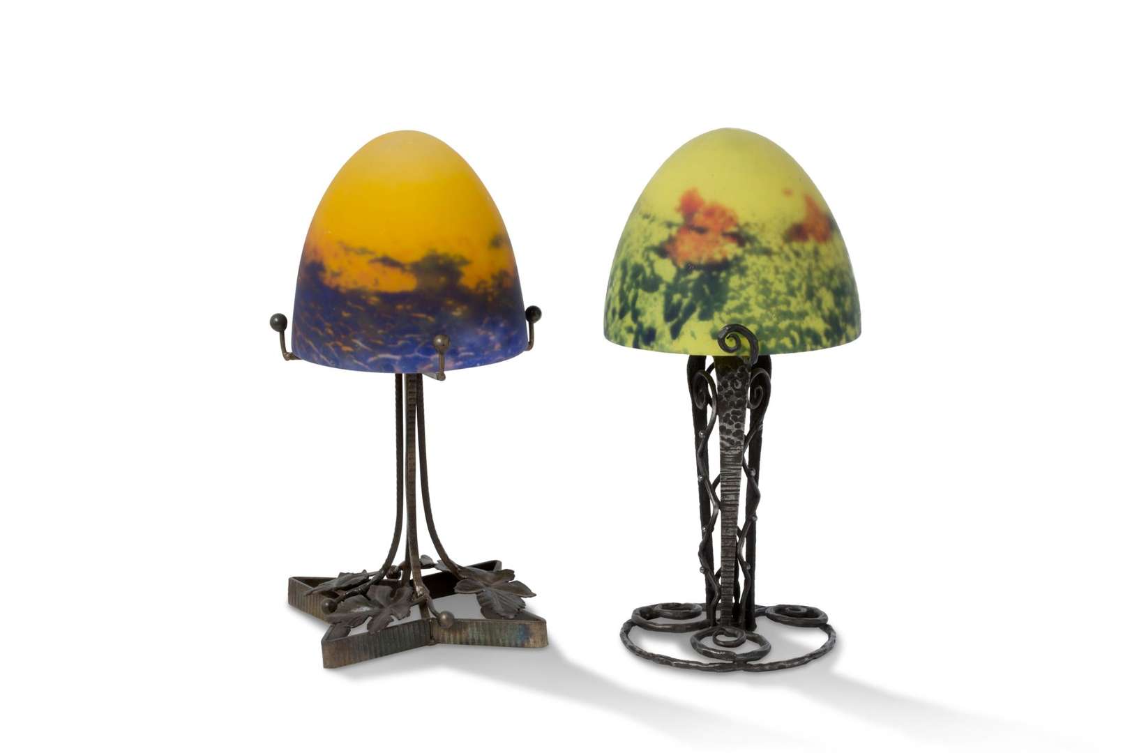On y joint une lampe champignon en verre marmoréen vert nuancé vert sapin et rouge, structure en fer forgé.