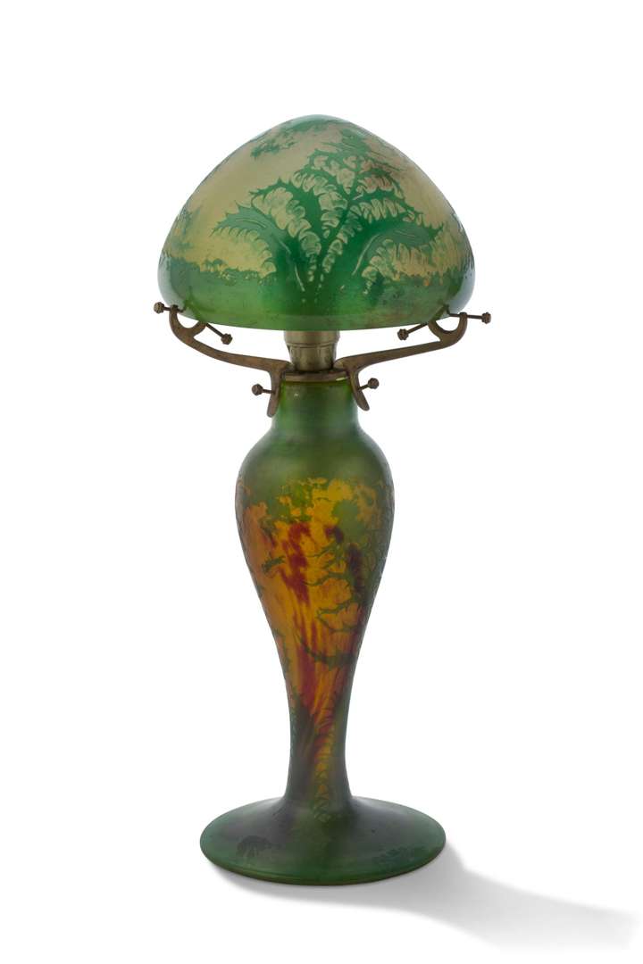 En verre multicouche vert sur fond jaune et rouge, à décor gravé à l'acide de chardons.