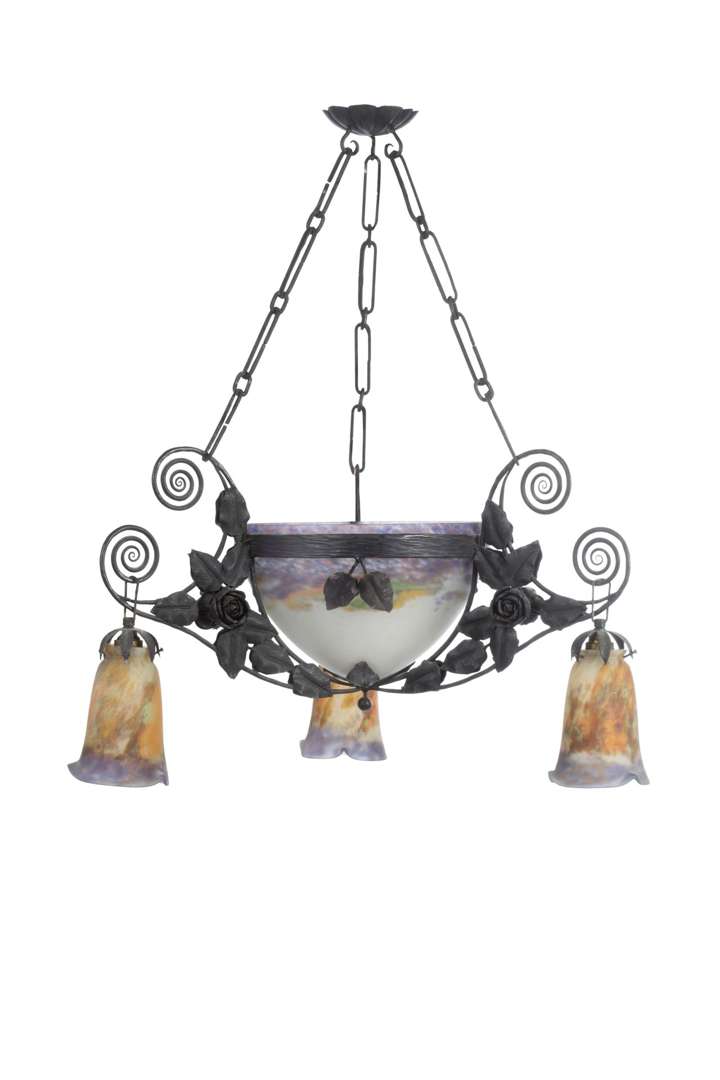A structure en fer forgé, vasque et tulipes en verre marmoréen orangé et violacé
