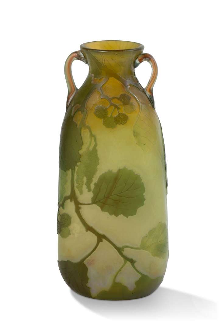 En verre multicouche vert sur fond satiné jaune, à décor gravé à l'acide de branchages.