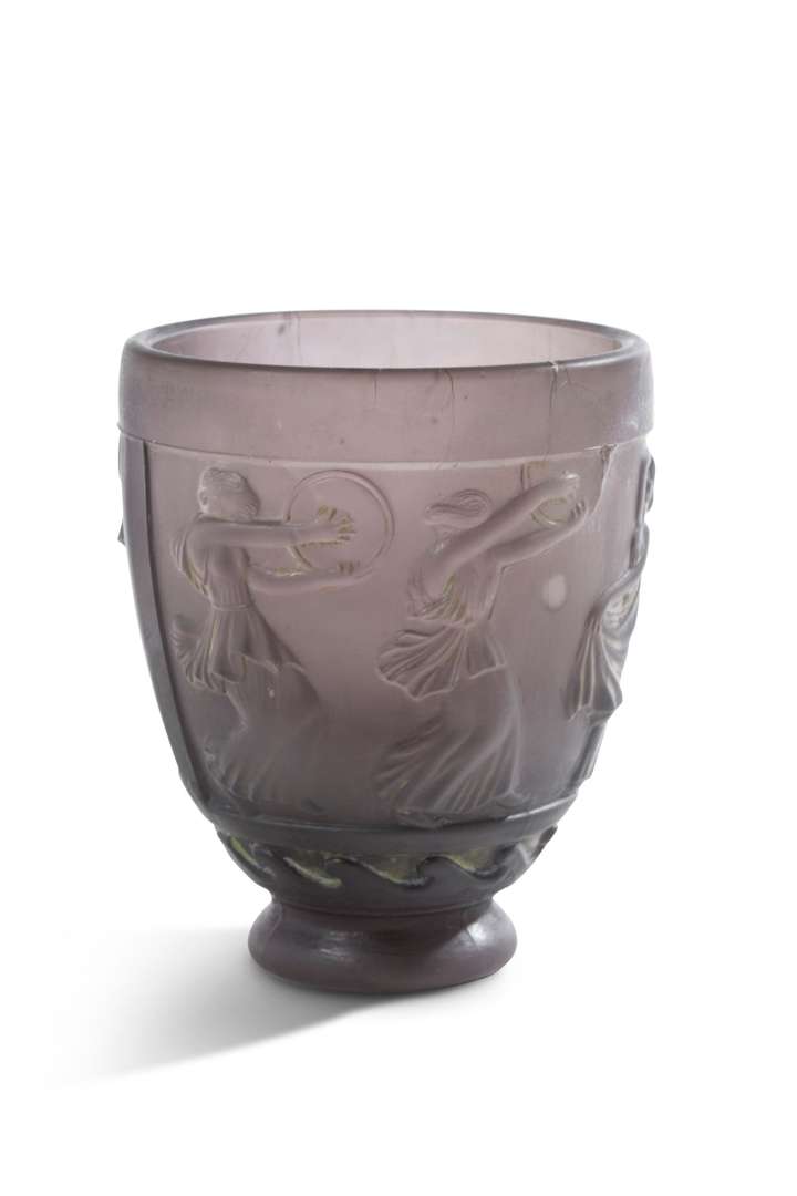 En verre moulé teinté prune, à décor d'une frise de femmes à l'antique