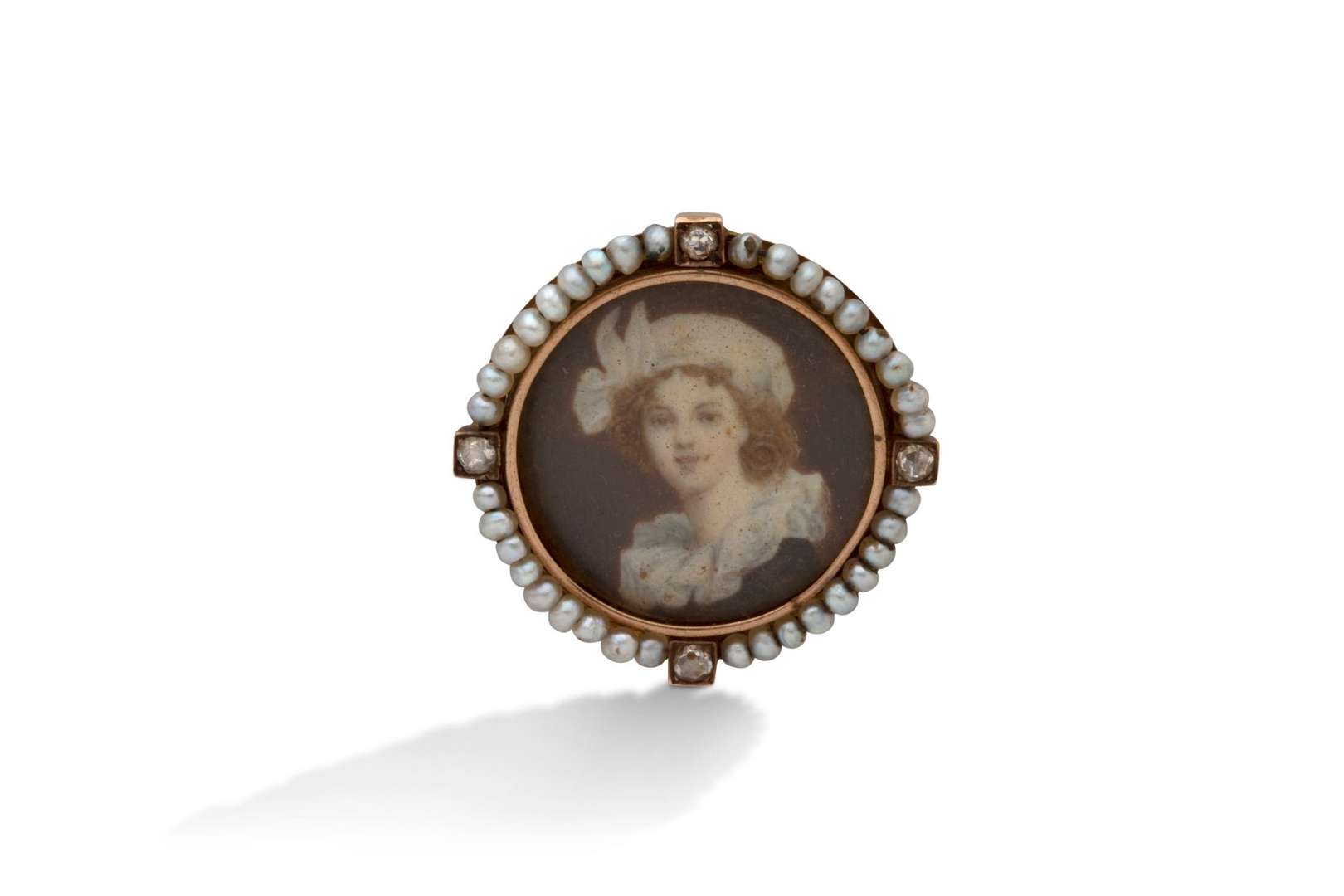 Portrait de jeune femme, entourage de perles et diamants taille rose