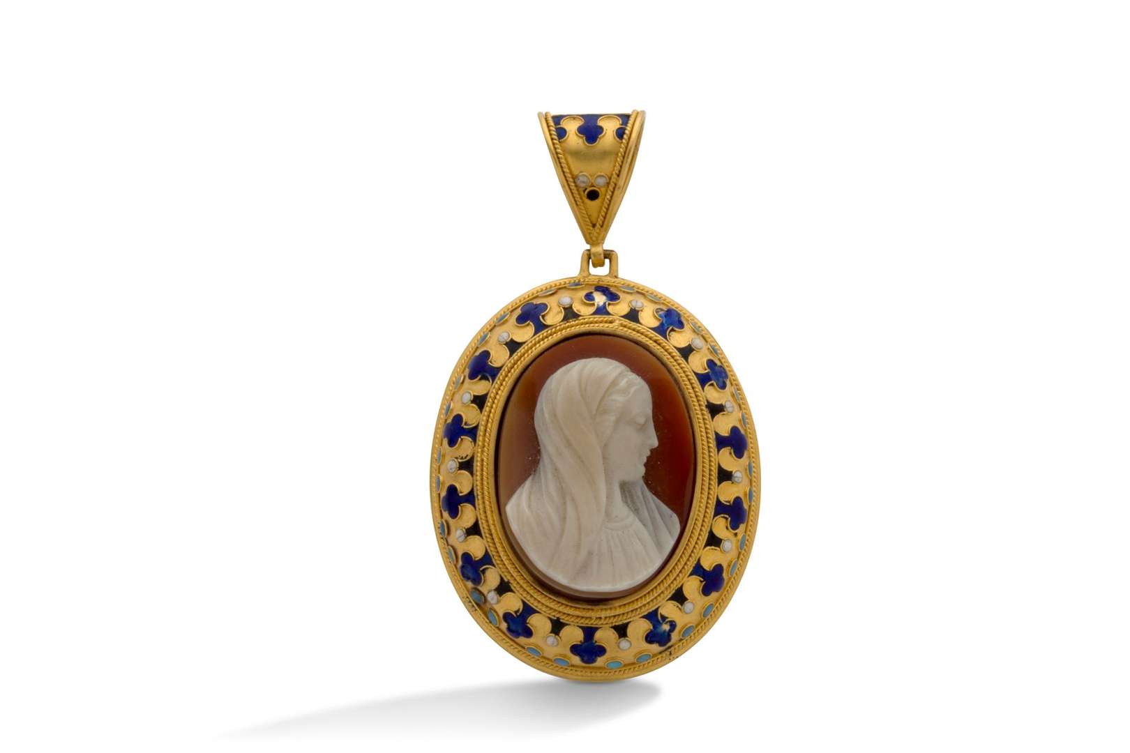 Camée sur agate, émail bleu et blanc