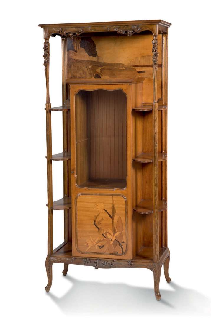 En noyer mouluré et marqueterie, à corps quadrangulaire ouvrant par une porte centrale vitrée en partie haute découvrant une étagère, flanquée de part et d'autre de quatre étagères ouvertes.