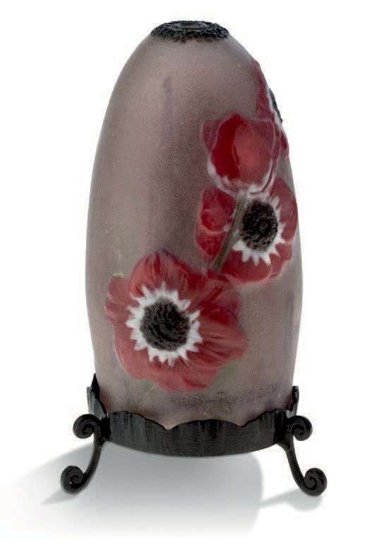 En pâte de verre rouge, blanche, noire et verte sur fond marmoréen, à décor de coquelicots.