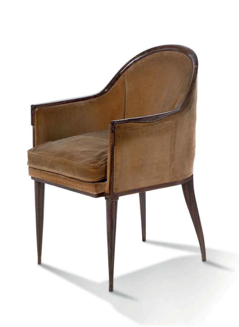 Macassar. La renommée de l'ensemblier repose sur l'harmonie créée entre les matériaux utilisés, la réconciliation de la ligne et de la couleur, dont le fauteuil « Guindé » présenté dans la vacation du 29 février est un bel exemple.