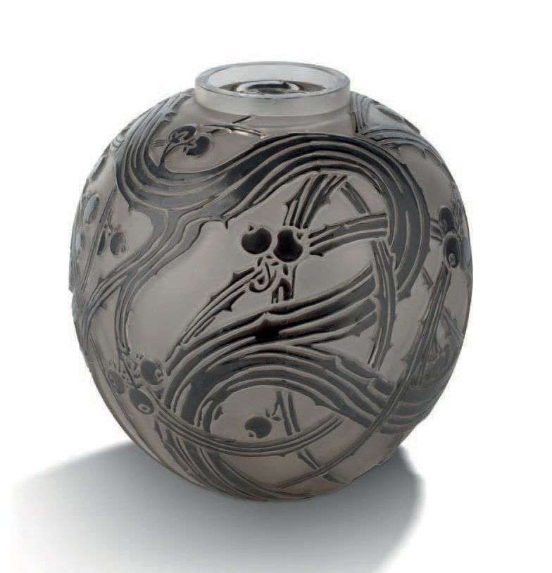 En verre moulé pressé satiné, rehauts d'émail noir, à décor de baies dans des entrelacs de ronces.