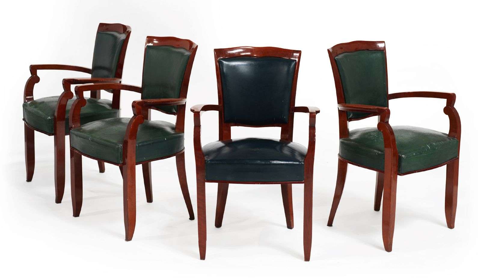 SUITE DE QUATRE PETITS FAUTEUILS En acajou vernis à dossier légèrement galbé, accotoirs en arc de cercle à découpe mouvementée se prolongeant en pieds avant, assise et dossier gainés de cuir vert foncé.