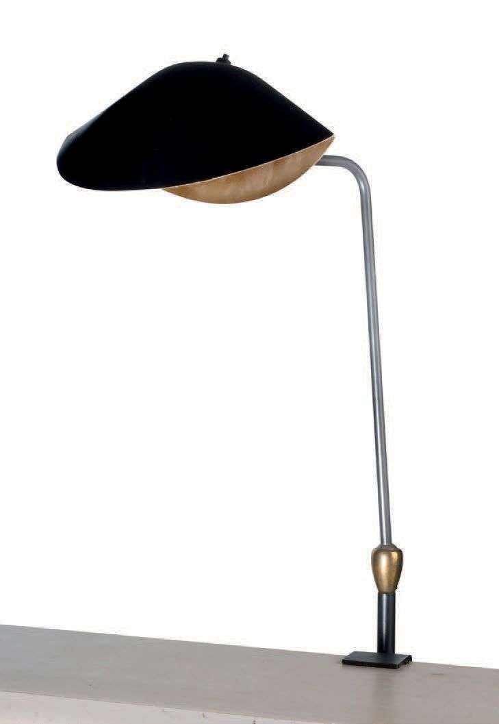 Bras et agrafe en acier relaqué noir, réflecteur ovoïde en aluminium plié laqué noir à l'extérieur et or à l'intérieur, rotules et vis de serrage en laiton.