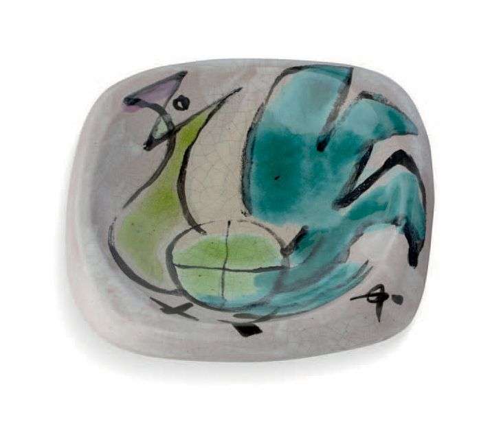 En faïence émaillée vert, bleu, noir et rose, à décor d'oiseaux.