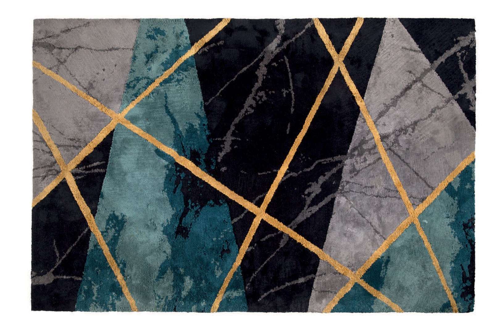 En laine tuftée, à motifs géométriques, teintes jaunes, bleues, noires et grises.