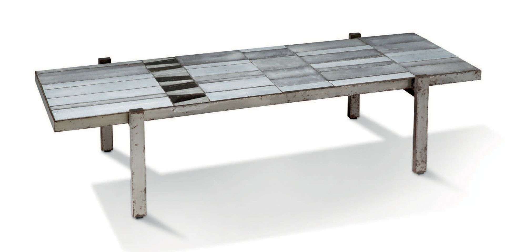 Piètement en acier brossé, plateau rectangulaire accueillant des plaques de lave volcanique émaillée gris, noir et blanc.