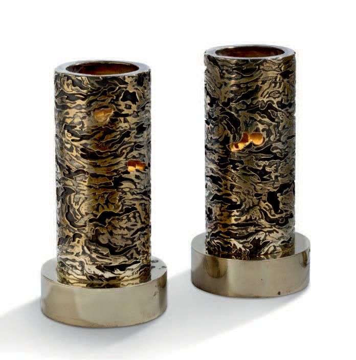 En bronze doré et patiné, le fût cylindrique à décor végétal stylisé partiellement évidé, reposant sur une base circulaire.