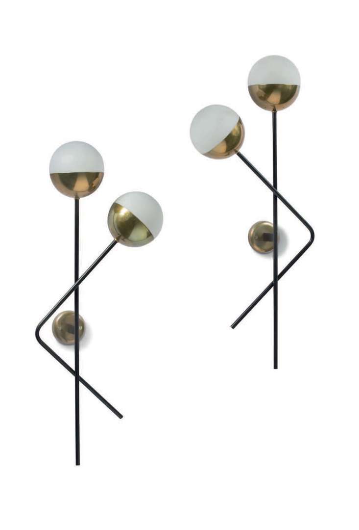 À deux bras de lumière, en métal tubulaire laqué noir, se terminant par des sphères en laiton doré et opaline blanche, platine de fixation en laiton.