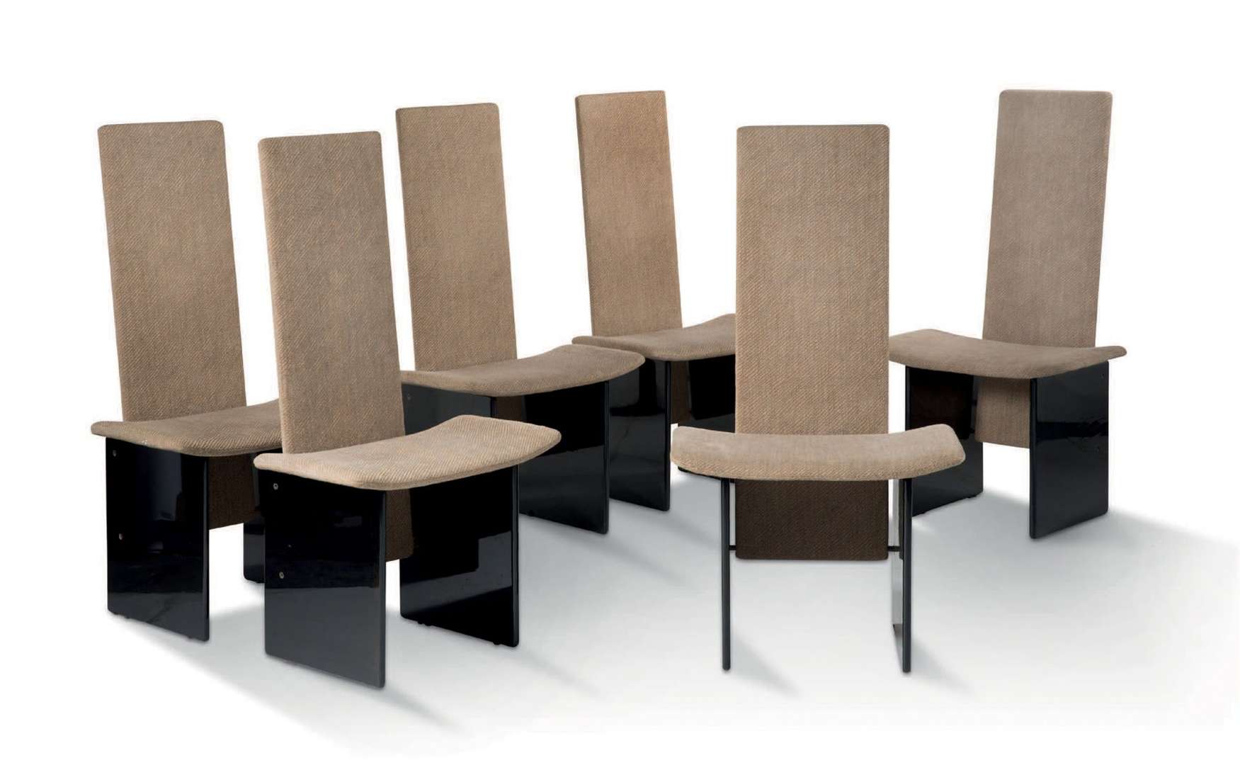 Haut dossier et assise recouverts d'un tissu crème, piètement en bois laqué noir.