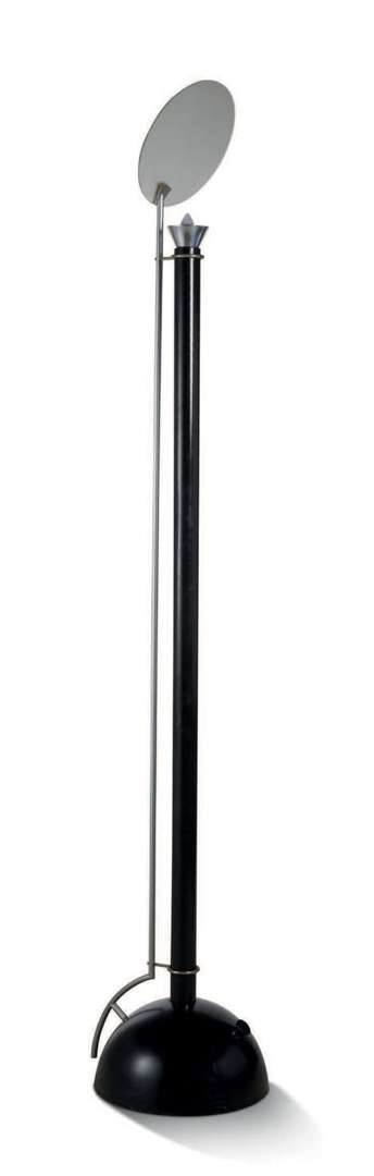 Base hémisphérique et fût tubulaire en métal laqué noir, réflecteur formé d'un disque en verre.