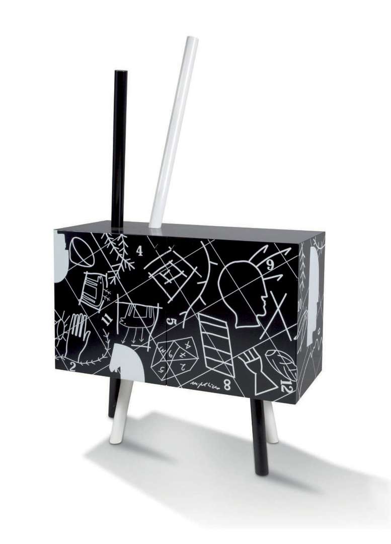 En bois laqué noir, ouvrant par deux vantaux découvrant quatre étagères, à décor de motifs blancs figuratifs, piètement quadripode en métal laqué noir et blanc.