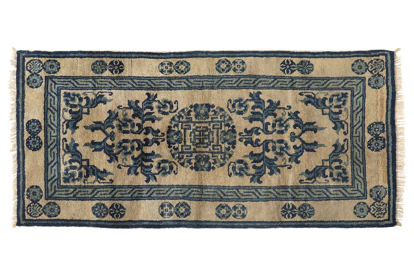 Velours de laine sur fondations en coton. Champ beige à décor de fleurs de lotus stylisées géométriquement bleu nuit orné d'un disque central.