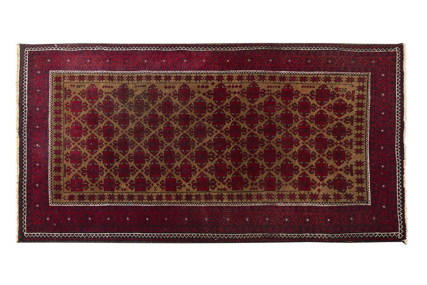 Velours de laine sur fondations en coton. Champ tabac à mosaïque de motifs géométriques grenat en forme de boucliers entourés de cornes de béliers stylisées.