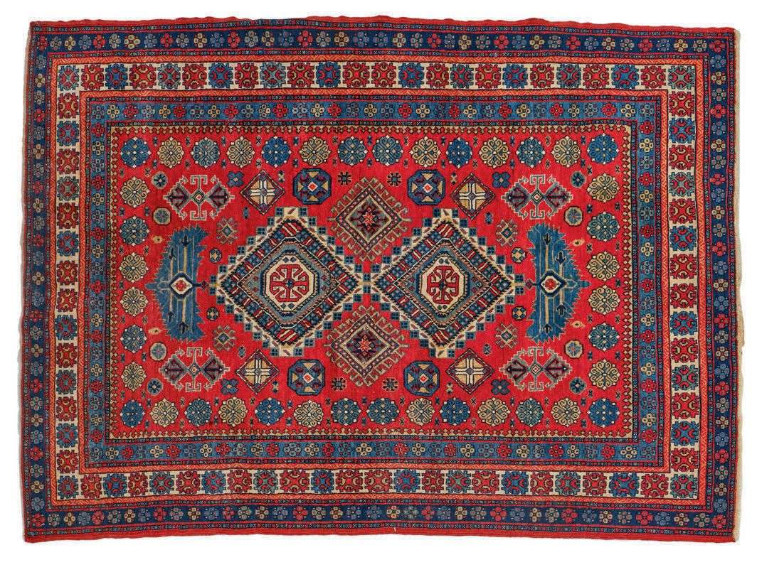 Velours de laine sur fondations en coton. Champ rouge brique à décor de multiples symboles représentatifs du sol encadrant deux médaillons en forme de losanges incrustés de crabes stylisés en polychromie. Triple bordure dont la principale beige à semis de tarentules multicolores.