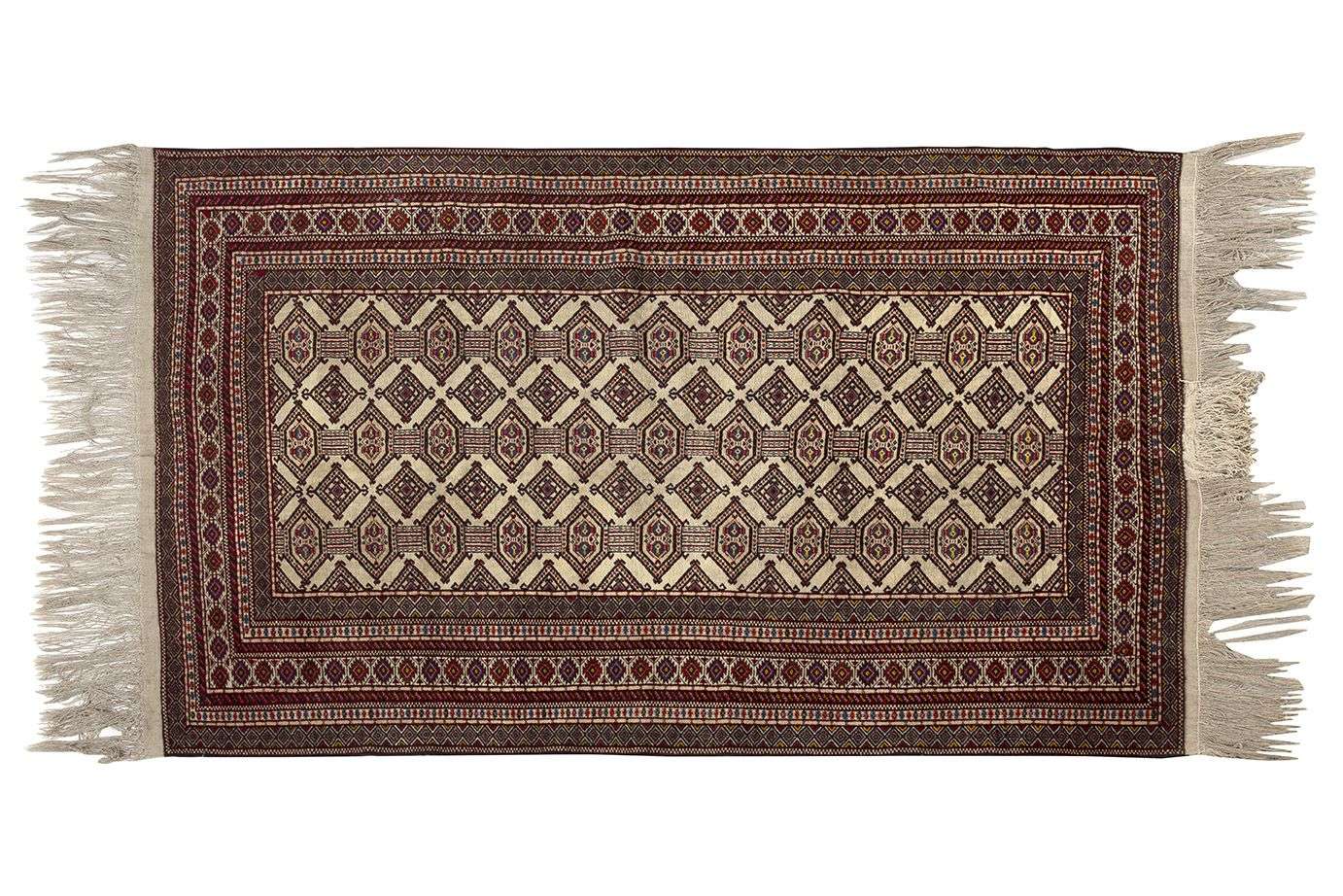 Velours de laine sur fondations en coton. Champ beige à décor de rangées de guhls stylisés en forme de diamants.