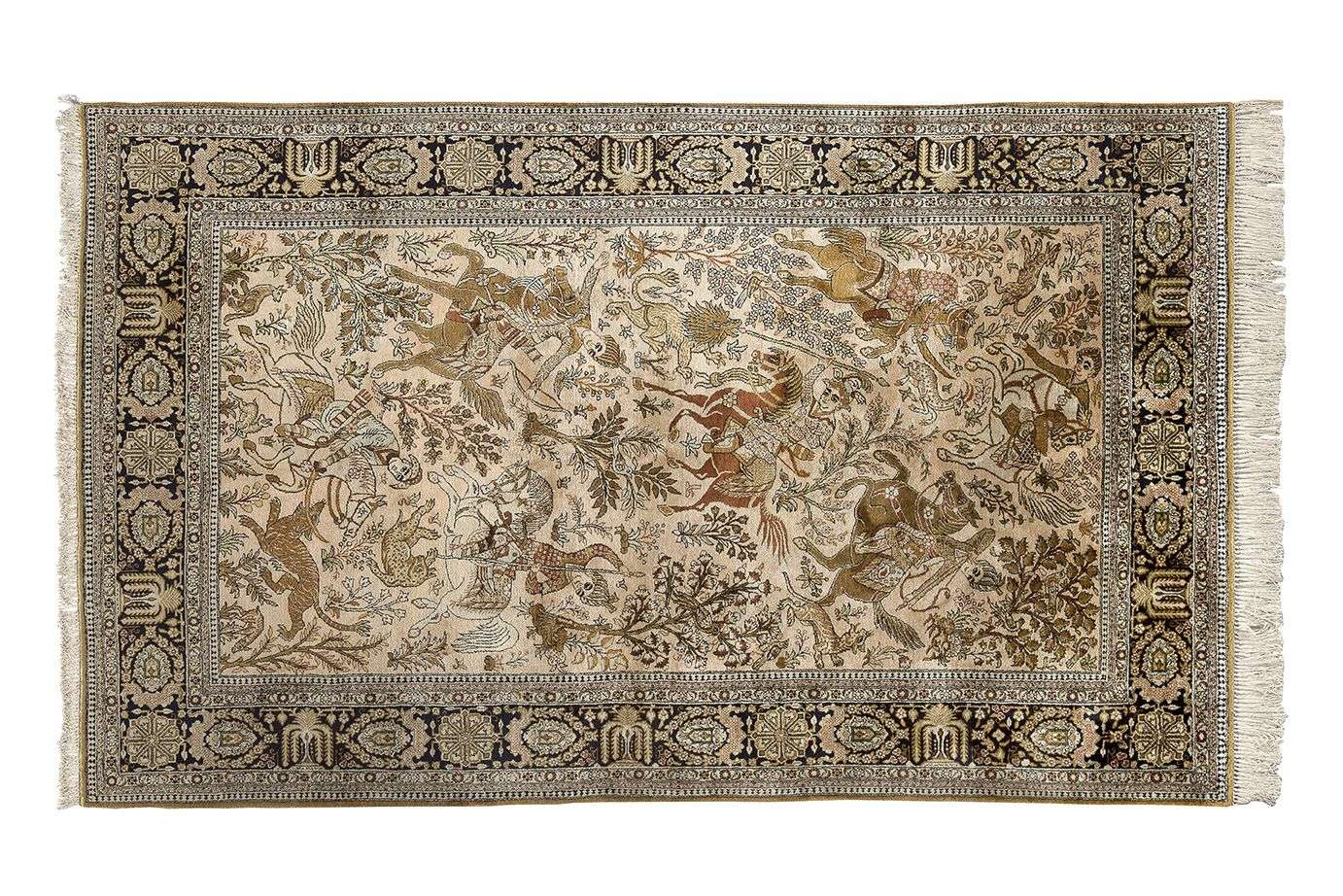 Velours de soie sur fondations en soie. Champ beige à décor de scène de chasse. À guerriers et chasseurs entourés d'animaux et d'arbres de vie richement fleuris. Bordure principale bleu nuit à composition de bulbes floraux et plantes en forme de saules pleureurs et chandeliers stylisés.