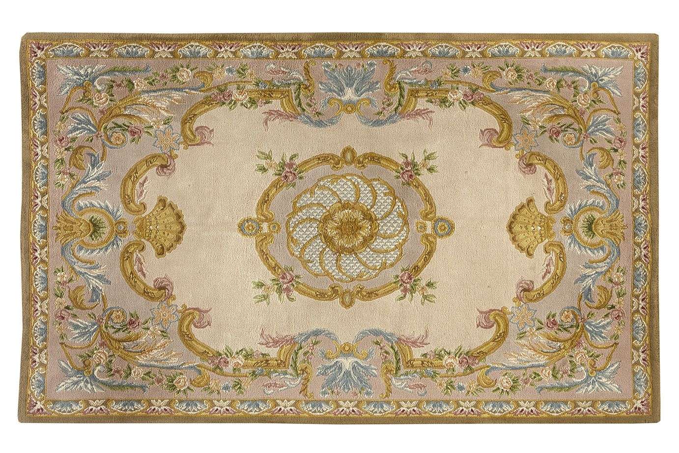 Velours de laine sur fondations en coton. Champ beige à décor d'un large médaillon central floral formé par un cadre à l'imitation du bois doré à guirlandes fleuries polychromes. Bel encadrement de guirlandes fleuries multicolores.