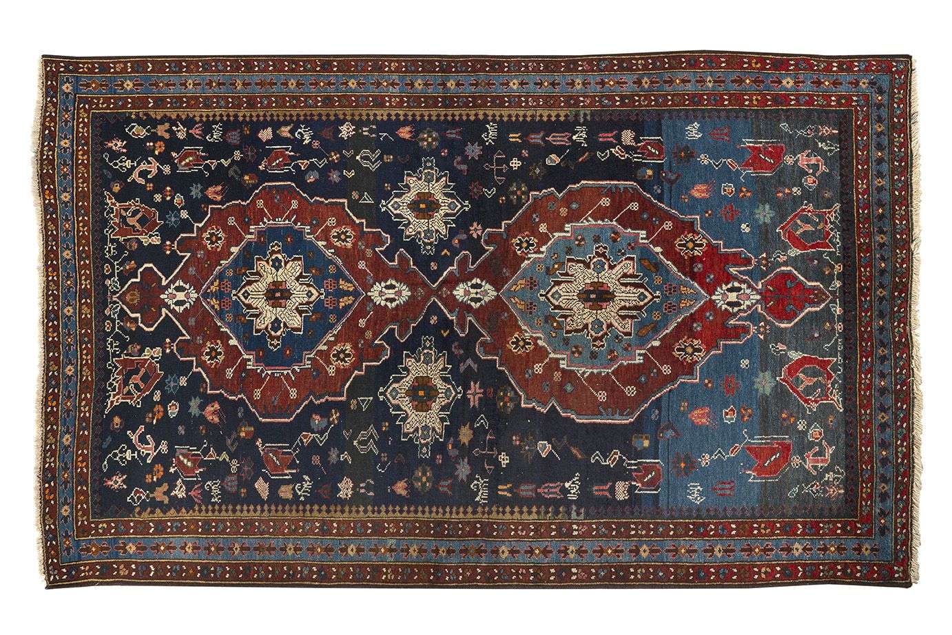 Velours de laine sur fondations en laine. Champ bleu nuit abraché à décor géométrique.